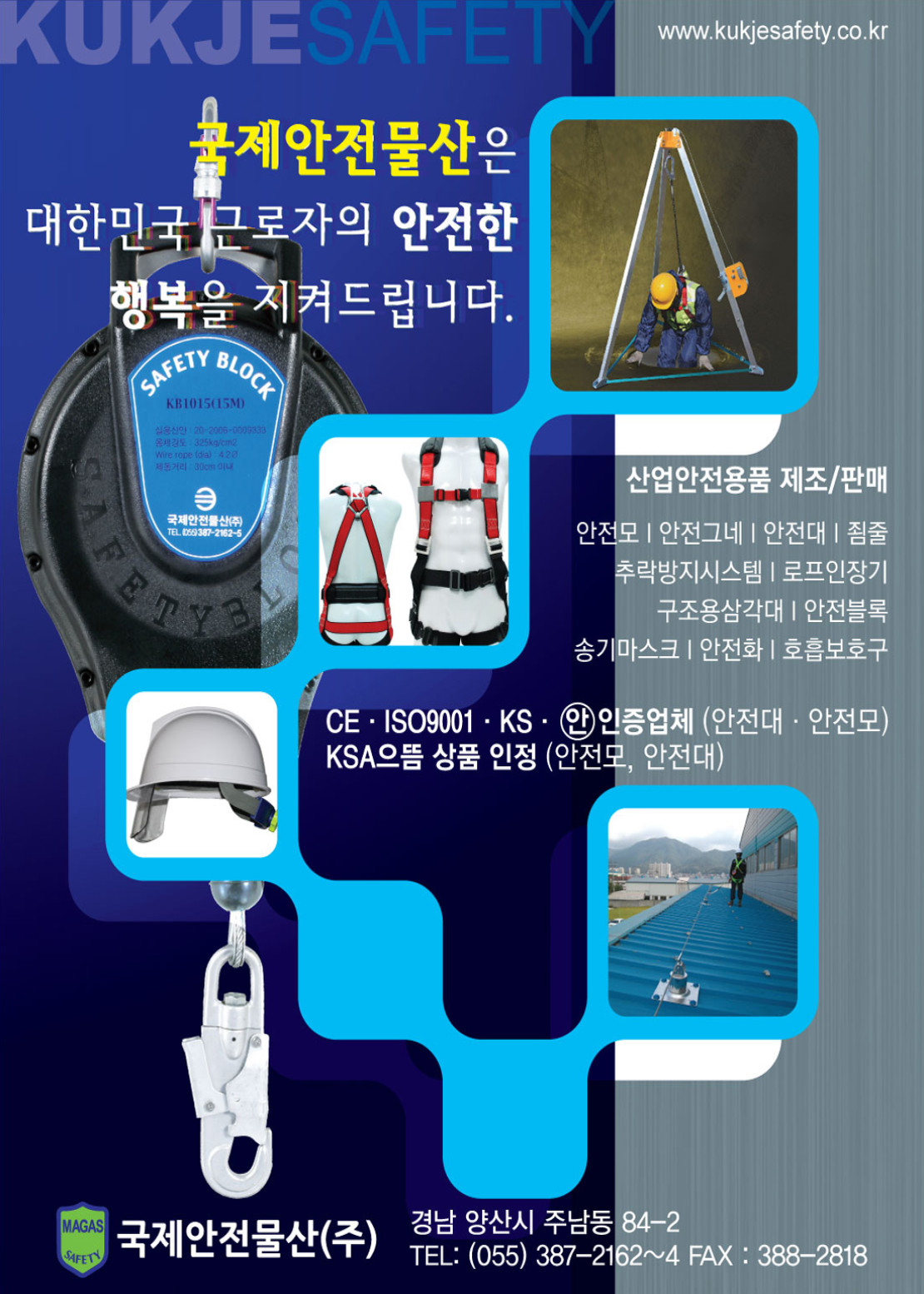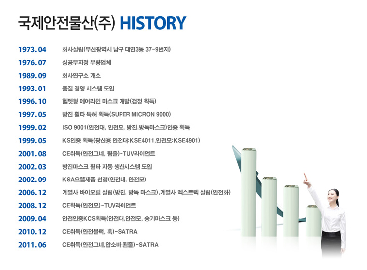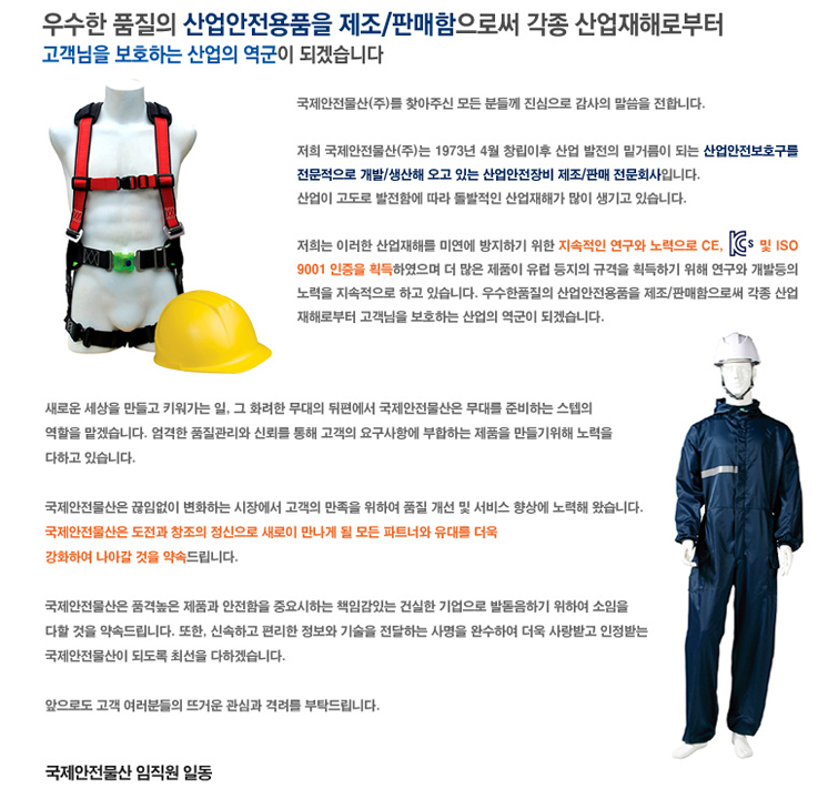 저희 국제안전물산(주)는 1973년 4월 창립 이후 산업발전의 믿거름이 되는 산업안전보호구를 전문적으로 개발/생산해오고 있는 산업안전장비 제조/판매 전문회사 입니다. 산업이 고도로 발전함에 따라 돌발적인 산업재해가 많이 생기고 있습니다. 저희는 이러한 산업재해를 미연에 방지하기 위한 지속적인 연구와 노력으로 CE, KCS, ISO9001 인증을 획득하였으며, 더 많은 제품이 유럽 등지의 규격을 획득하기 위해 연구와 개발 등의 노력을 지속적으로하고 있습니다. 저렴하고 기능좋은 산업안전용품을 제조/판매함으로써 각종 산업재해로부터 고객님을 보호하는 산업의 역군이 되겠습니다.
