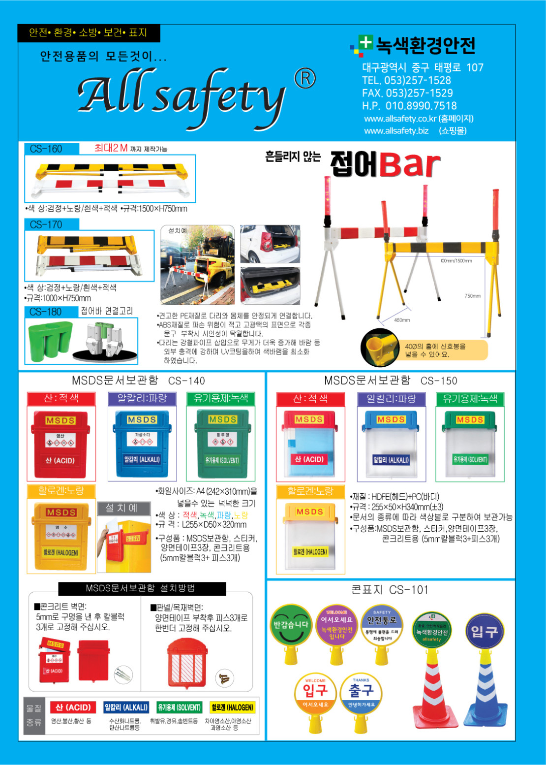 Allsafety홈페이지를 오픈하며,. 조그마한 실수 하나가 큰 사고를 불러옵니다. 모두가 한결같은 마음으로 서로를 지켜보고 안전한 사업장을 만들기 위하며 최선을 다하듯 Alsaietv는 많은 근로자들이 안전에 완한 어떤 물품들이 있는지 무엇이 적합하고, 또 그것품 정확하게 알고 사용할 수 있도록 정보를 제공하며 쾌적한 일터를 만드는데 도움이 되었으면 하는 마음을 담았습니다. Allsafety는 젊은 패기와 도전의 정신으로 여러분의 안전을 책임지겠습니다. 대표 최 성 혁 Senghyeok Che |
