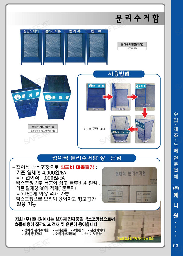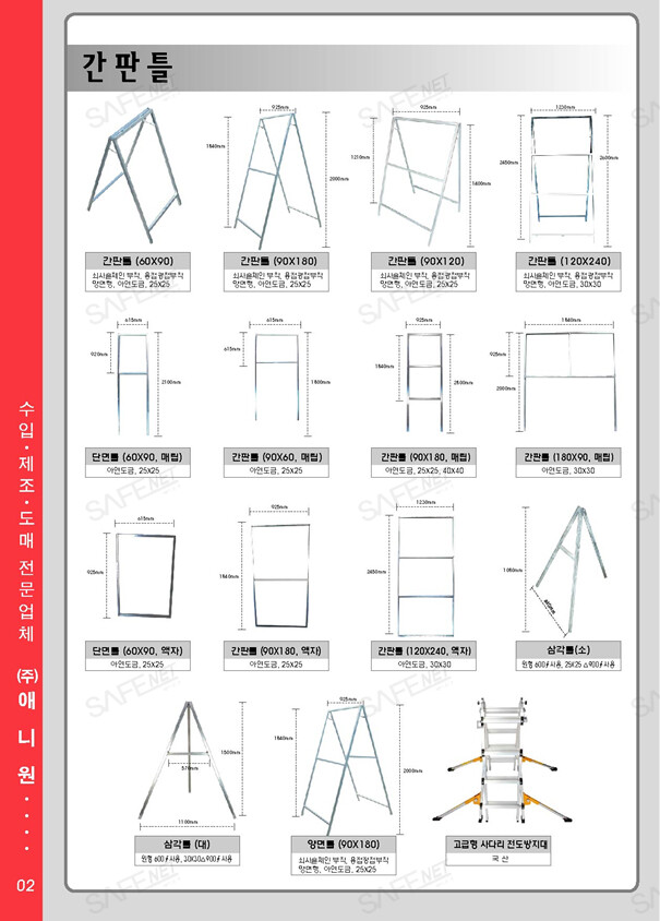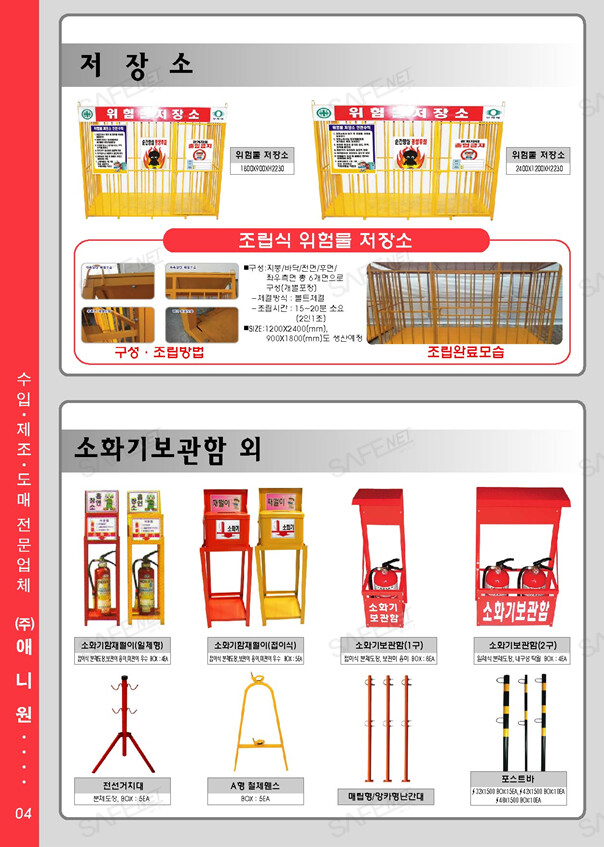 당사는 안전용품 신제품을 개발하고, 범용제품을 중국에서 제조/수입하며, 일부제품은 국내 자체제조 또는 OEM 생산하여 판매하는 국내1등 전문 기업입니다. 주요생산 및 취급품목은 다음과 같습니다. - 철재제품류 : 표지판틀, 철재A형휀스, 철재전자립식선거치대, 소화기재떨이, 소화기보관함, 조립식위헙물저장소, 토공용지주(포스트바), 철망형분리수거함 등 - 프라스틱사출제품류 : 원형깜박이, 칼라콘걸이대, 칼라콘고무덮개, 실리콘파이프캡(48파이), 프라스틱전선거치대, 프라스틱체인 등 - 봉제제품류 : 밴드각반, 신호수조끼, X반도조끼 등 - 기타제품류 : 메가폰,전자신호봉,구급함,구급낭,용접포,불티비산방지막,불티비산방지우산 등 - 특허/실용제품류 : 비상피난유도등, 간이소화장치, 프라이드고급각반 등 애니원씨앤씨는 항상 저렴한 가격에 제품을 공급하고자 노력하고 있습니다. 감사합니다 |