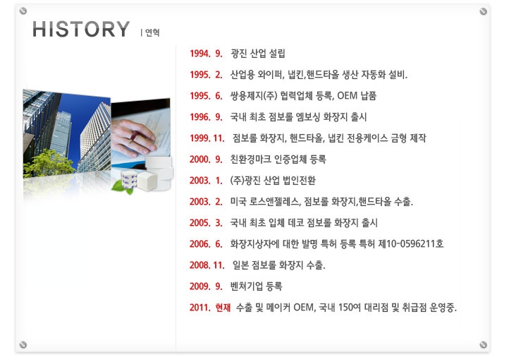 산업용와이퍼, 핸드타올, 점보롤화장지, 유흡착제, 냅킨, 물티슈, 키친타올 등을 생산하는 전문기업 광진산업입니다.