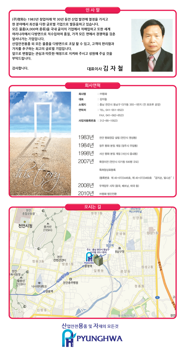 (주)평화는 물류전문 도매업체로 다양한이이템과 저렴한 가격으로 동종업계와는 차별화된 경쟁력과 신속,정확한 공급을 하고자 최상의 품질과 신뢰를 바탕으로 고객만족을 제일의 목표로 정하고 있습니다. 당사는 중국,베트남 등 해외수입제품을 직수입하고 다양한 제품을 공장과 직거래하는 업체로 현재 4000여 가지 제품이 등록되어 있습니다. 1983년 평화장갑으로 사업을 시작하여 2010년 4월에 (주)평화로 법인전환을 하여 약 30년간 동종업계에 종사하면서 거래처 1000곳을 보유하고 있습니다. 앞으로 한단게 올라가 고객님께 먼저 다가가는 평화롤 거듭나도록 최선을 다하겠습니다. 감사합니다.