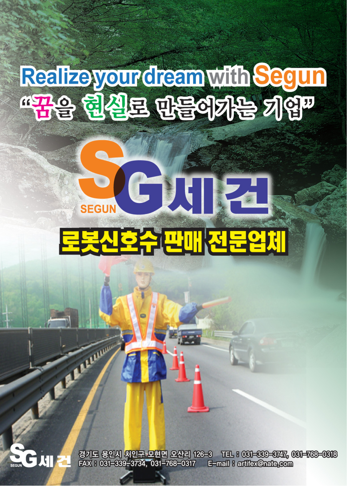 (주)세건산업 로봇신호수의 필요성을 한마디로 표현한다면 '인간이 하는 위험한 일을 대신한다'라고 할 수 있습니다. 최근 십여년동안 국내외 로봇산업은 그야말로 눈부시게 발전했다고 할수있습니다. 용접,도장,조립,물류,검사 등 산업용 로봇을 비롯해 청소로봇,잔디깍기로봇 등 서비스용 로봇 그리고 원자력, 국방, 재해방지, 의학 등 특수목적용 로봇 등 그 종류와 활용도 또한 매우 다양합니다. 그 반면에 위험도에 비하여 건설공사 현장에서의 로봇 활용도는 매우 미미한 실정입니다. 이에 저희 (주)세건산업은 건설현장 및 도로공사 현장에서 안전에 가장 취약한 차량유도원을 대신할 수 있는 로봇신호수를 개발하게 되었으며 뛰어난 기술력을 바탕으로 안전사고 예방 및 사업장의 매출증대를 위한 제품개발에 주력하고 있습니다.
