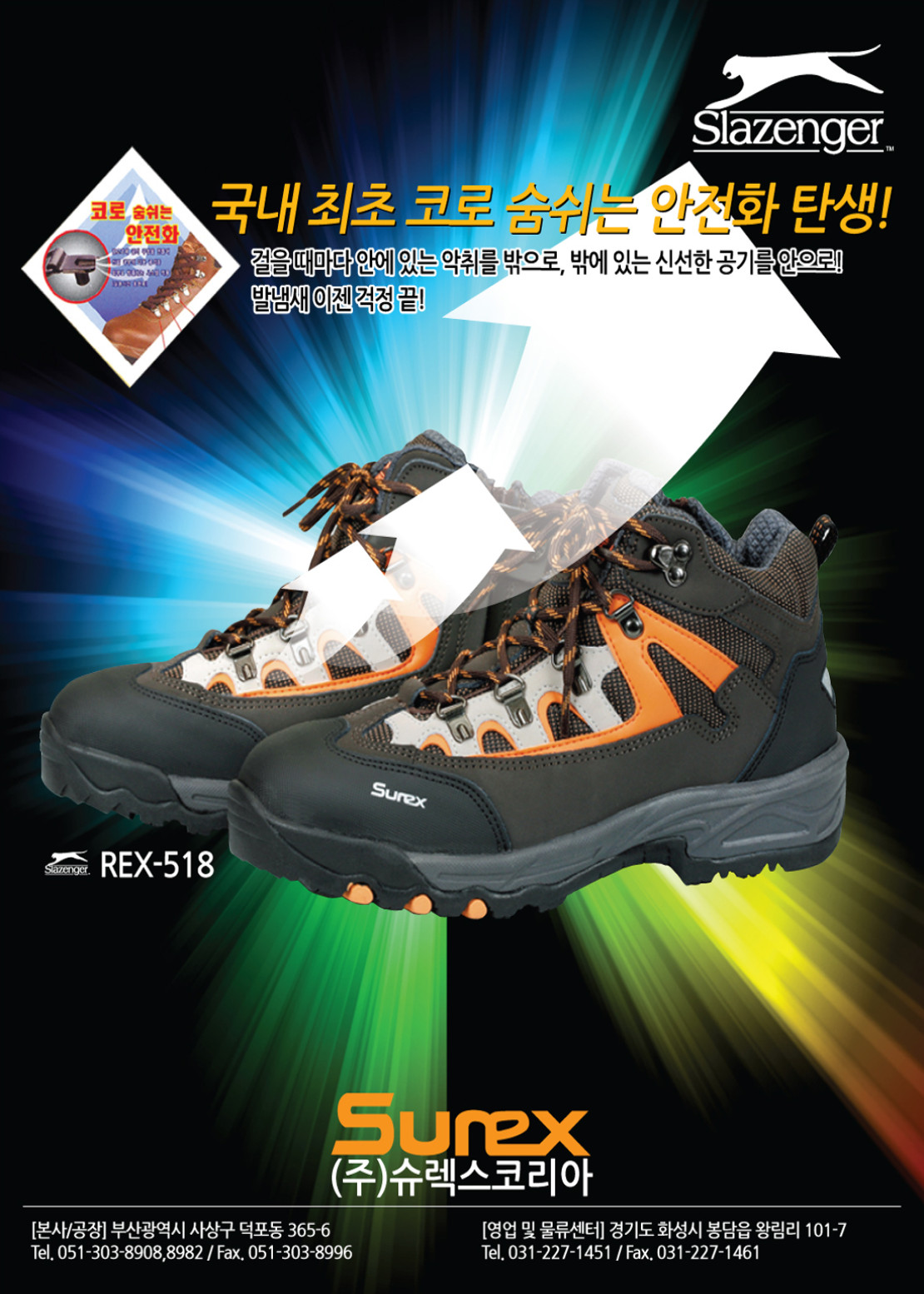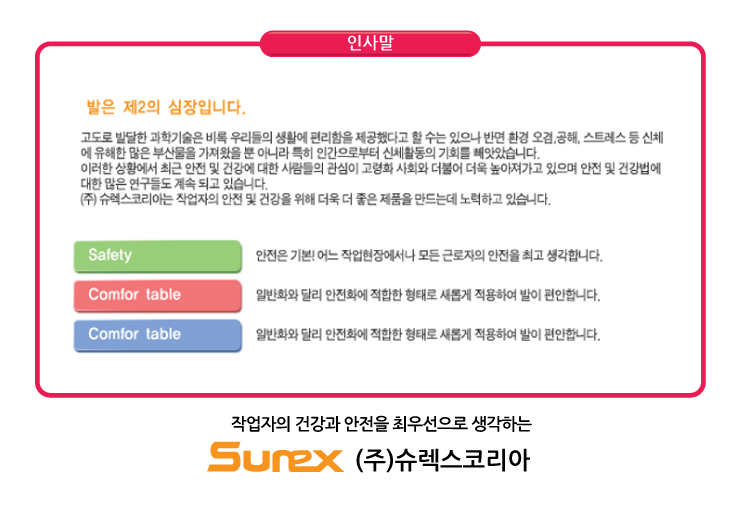 고도로 발달한 과학기술은 비록 우리들의 생활에 편리함을 제공했다고 할수는 있으나 반면 환경오염, 공해, 스트레스 등 신체에 유해한 많은 부산물을 가져왔을뿐 아니라 특히 인간으로부터 신체활동의 기회를 빼앗았습니다. 이러한 상황에서 최근 안전 및 건강에 대한 사람들의 관심이 고령화사회와 더불어 더욱 높아져가고 있으며 안전 및 건강법에 대한 많은 연구들도 계속되고 있습니다. (주)슈렉스코리아는 작업자의 안전 및 건강을 위해 더욱 더 좋은 제품을 만드는데 노력하고 있습니다.