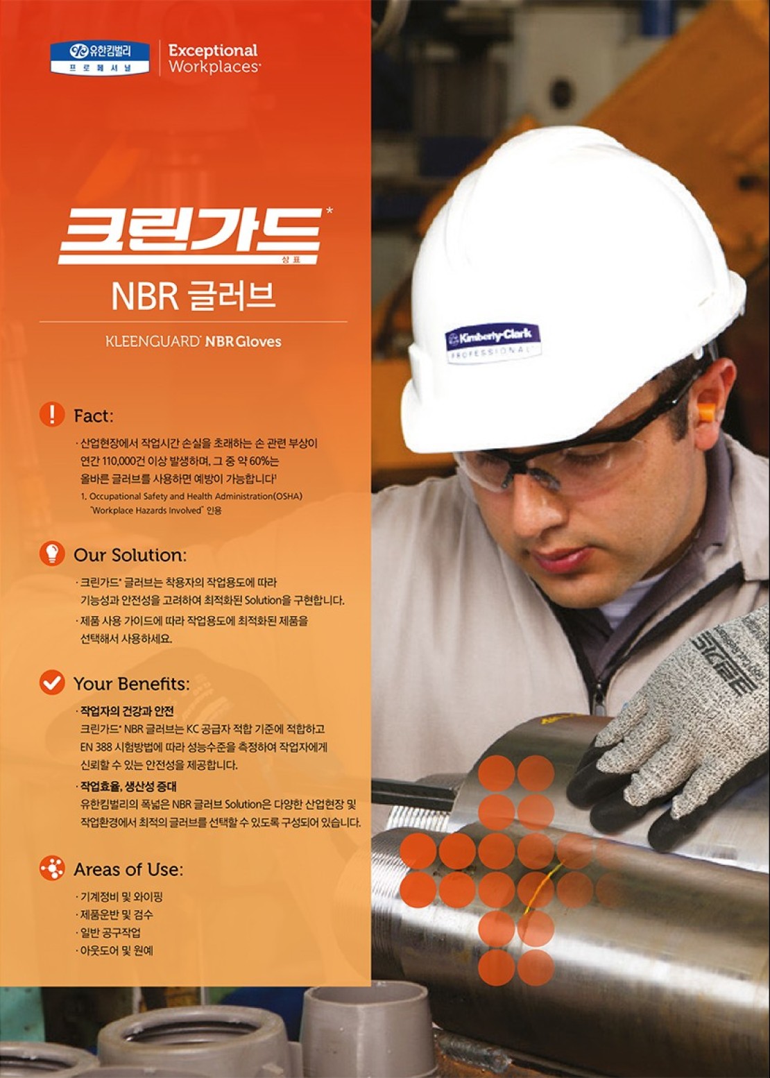 사무실, 제조현장, 학교, 극장, 의료기관, 쇼핑몰 등 현대인들은 집 이외의 장소에서 많은 시간을 보내고 있습니다. 특히, 산업, 생산설비 영역에는 크린가드*, 와이프올*, 잭슨세이프티* 브랜드로 대표되는 보호복 / 산업용 와이퍼 / 방진마스크 / 귀마개 / 보안경 / 안전화 등 개인보호구 / 안전용품을 공급하여 작업자의 안전과 생산성 향상에 기여해 왔습니다. 이에 한 걸음 더 나아가 '더 나은 솔루션'을 제공하기 위해, '차별화된 산업 현장'에 맞는 다양한 방식의 프로그램을 준비하고 있습니다. |