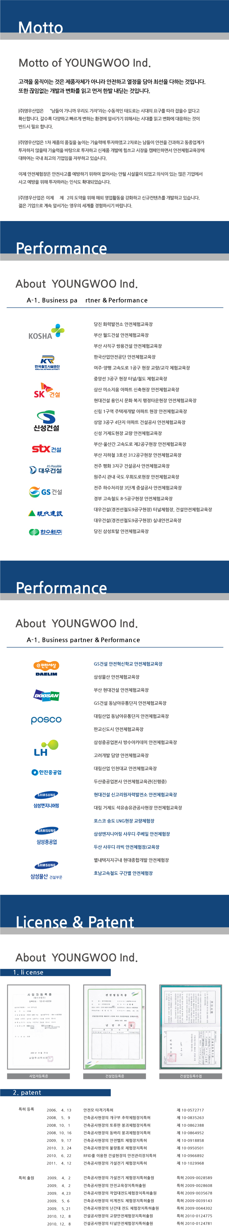 안녕하십니까 ? 저희 영우산업을 찾아주셔서 감사합니다. 저희 영우산업은 건설현장의 안전시설물 제작 및 시공을 전문으로 하고 있습니다. 특히 안전체험장의 제작,시공 및 설계에 있어서는 가장 많은 시공경력과 최고의 노하우를 가지고 있다고 자부합니다. 안전은 건설현장뿐만 아니라 사회 전영역에서 항상 기초에 있어야 할 필수 조건이 되었습니다. 저희 영우산업 전 임직원은 귀사의 안전을 책임지는 충실한 동반자가 될 수 있도록 성심 성의껏 최고의 작품을 만든다는 각오로 작업에 임할 것을 약속드리며 저희를 찾아 주시는 한분 한분과 소중한 인연이 될 수 있도록 모든 정성을 다할 것입니다. 영우산업은 젊습니다. 젊다는 것은 가능성이 무한하다는 것입니다. 끊임없이 성장해가는 저희 영우산업을 계속 지켜봐 주시기 바랍니다. (주)영우산업 대표이사 오영현 |