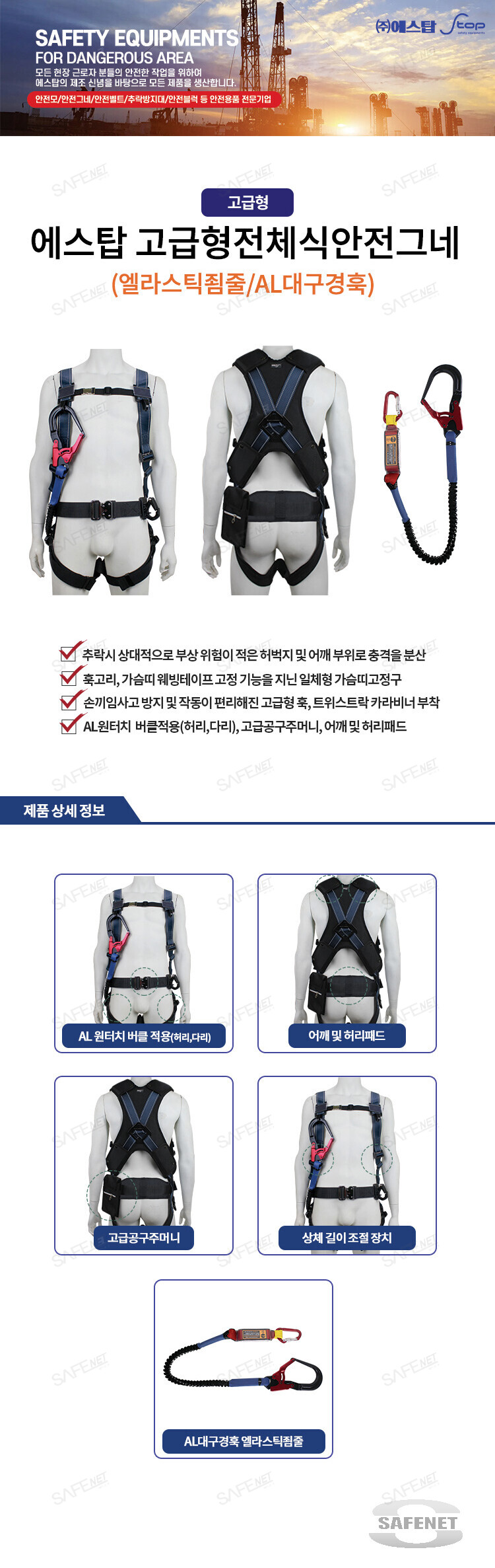 고급형 / 엘라스틱죔줄 / AL대구경훅 / AL원터치가슴및다리버클 / AL원터치허리벨트 / 고급공구주머니 / 상체길이조절장치 / 어깨패드,허리패드 |