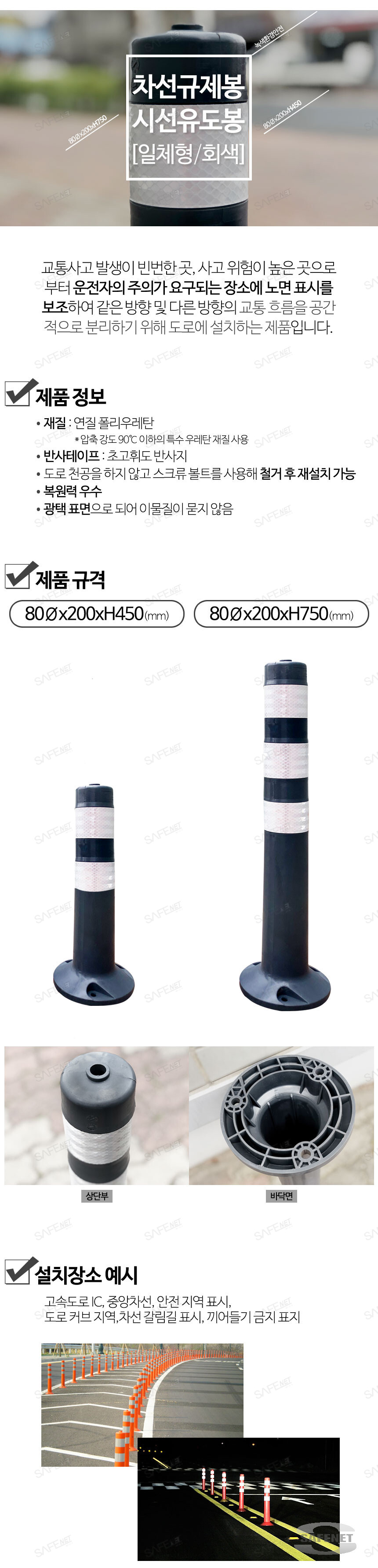 교통사고 발생이 빈번한 곳, 사고 위험이 높은 곳으로부터 운전자의 주의가 요구되는 장소에 노면 표시를 보조하여 같은 방향 및 다른 방향의 교통 흐름을 공간적으로 분리하기 위해 도로에 설치하는 제품입니다.