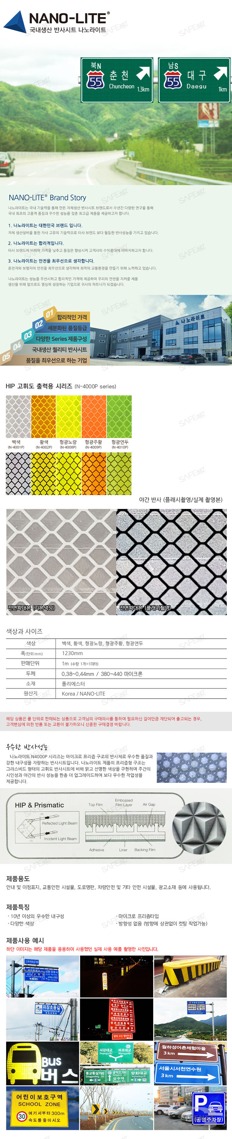 나노라이트 N4000P 시리즈는 마이크로 프리즘 구조의 반사체로 우수한 품질과 강한 내구성을 자랑하는 반사시트입니다. 나노라이트 제품의 프리즘형 구조는 그라스비드 형태의 고휘도 반사시트에 비해 맑고 선명한 색상을 구현하며 주간의 시인성과 야간의 반사 성능을 한층 더 업그레이드하여 보다 우수한 작업성을 제공합니다.