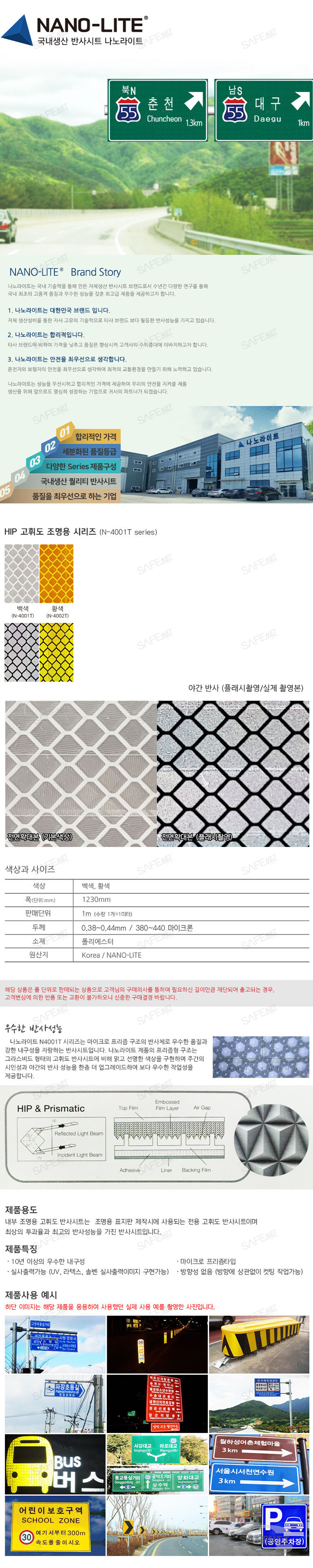 나노라이트 N4001T 시리즈는 마이크로 프리즘 구조의 반사체로 우수한 품질과 강한 내구성을 자랑하는 반사시트입니다. 나노라이트 제품의 프리즘형 구조는 그라스비드 형태의 고휘도 반사시트에 비해 맑고 선명한 색상을 구현하며 주간의 시인성과 야간의 반사 성능을 한층 더 업그레이드하여 보다 우수한 작업성을 제공합니다.