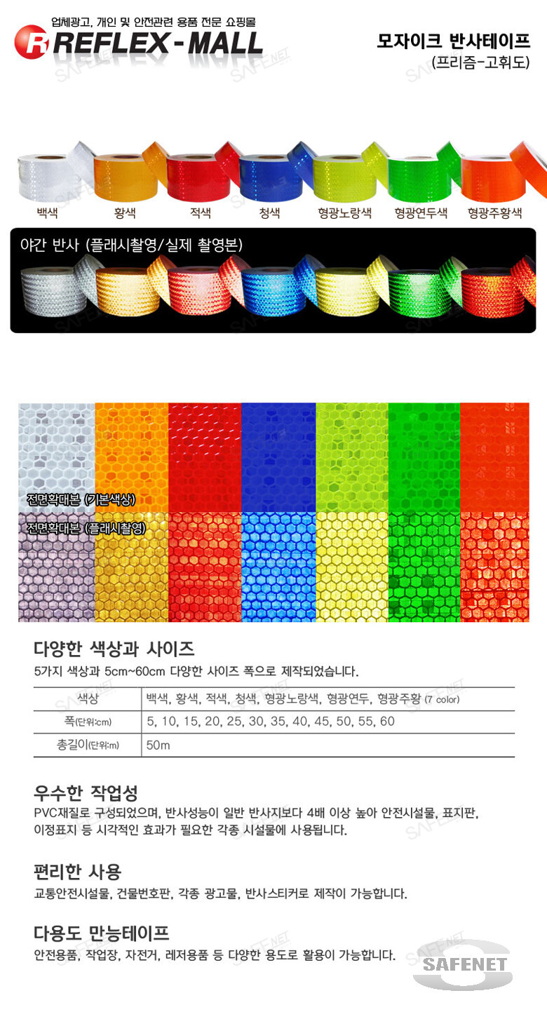 방향지시 프리즘(고휘도) 반사테이프 색상 : 백색, 황색, 적색, 청색, 형광노랑색, 형광연두색, 형광주황색 형태 : 벌집 6각 무늬 밴드형(점착형 테이프)