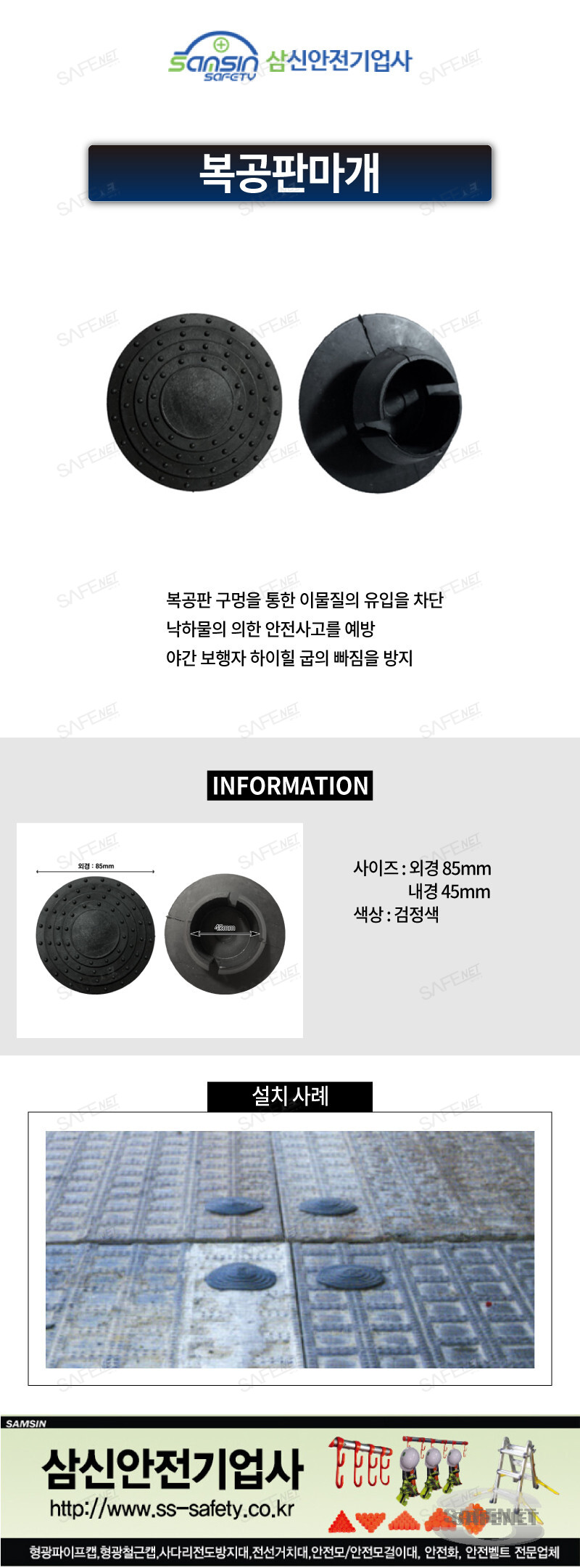 규격 외경: 85mm / 내경 : 45mm / 색상 : 검정색 / 복공판 구멍을 통한 이물질 유입 차단