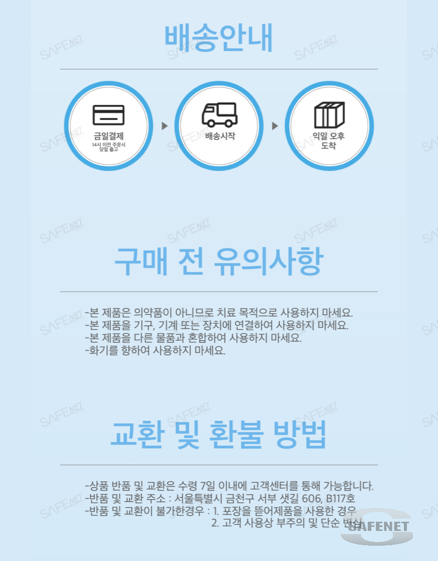 • 거래와 관련된 모든 내용은 구매자와 공급업체간 협의를 통해 정해야 하며, 세이프넷은 거래내용에 대한 어떠한 책임도 지지 않습니다.