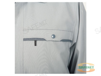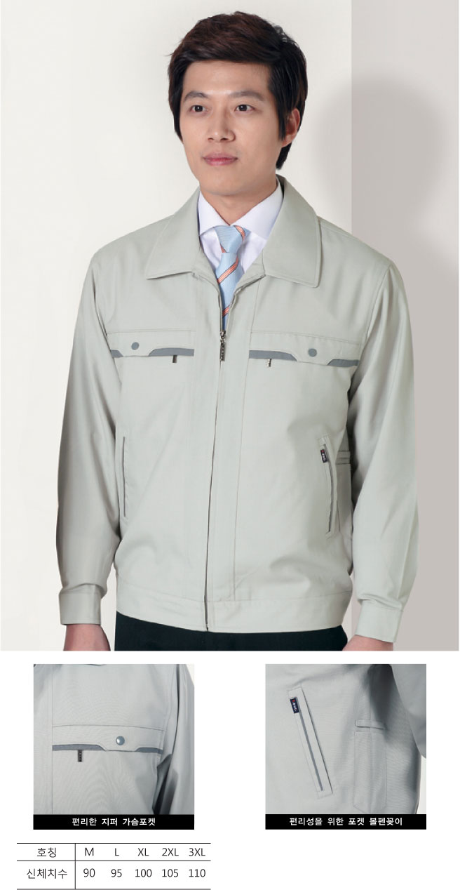 회색의 T/R트로피칼 원단을 사용하여 어디서나 편하게 입을 수 있고, 가슴포켓과 밑주머니에 배색으로 포인트를 준 산뜻한 느낌의 유니폼입니다.