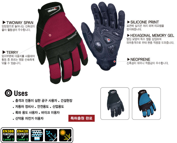 • 손등/활동성이 우수한 양방향 스판 사용 twoway span