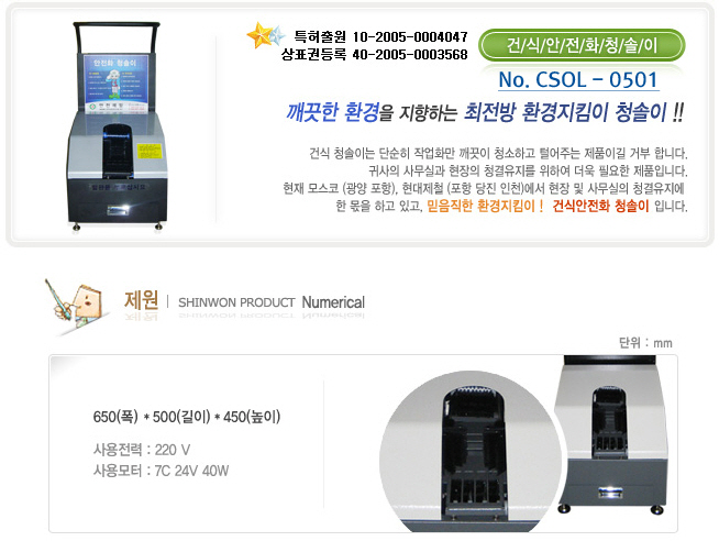 규격 650(폭) * 500(길이) * 450(높이), 1인용, 사용모터 7C, 24V, 40W
