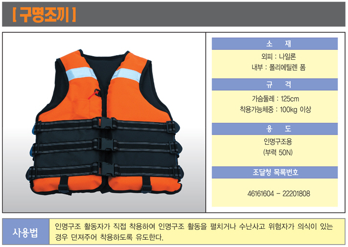 규격 가슴둘레(125cm), 착용가능체중(100kg 이상), 용도(인명구조용-부력50N)