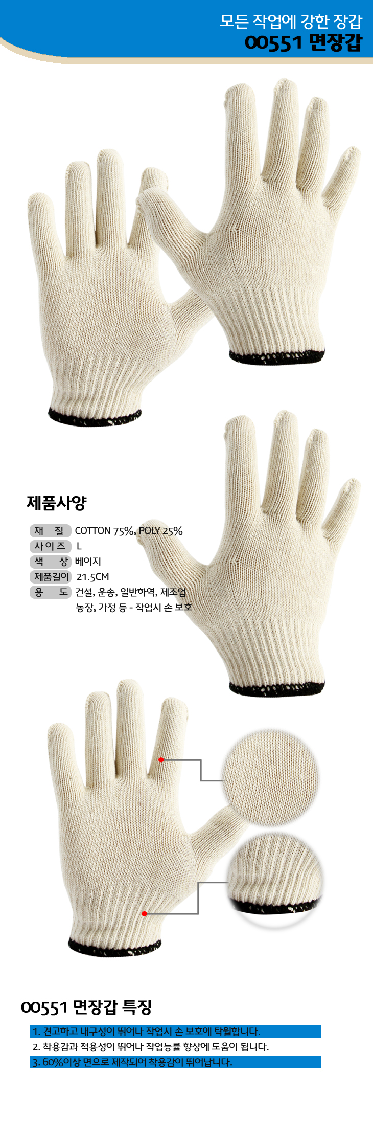 -견고하고 내구성이 뛰어나 작업시 손 보호에 탁월하다. -착용감과 적용성이 뛰어나 작업능률 향상에 도움이 됩니다. -60%이상 면으로 제작되어 착용감이 뛰어나다.