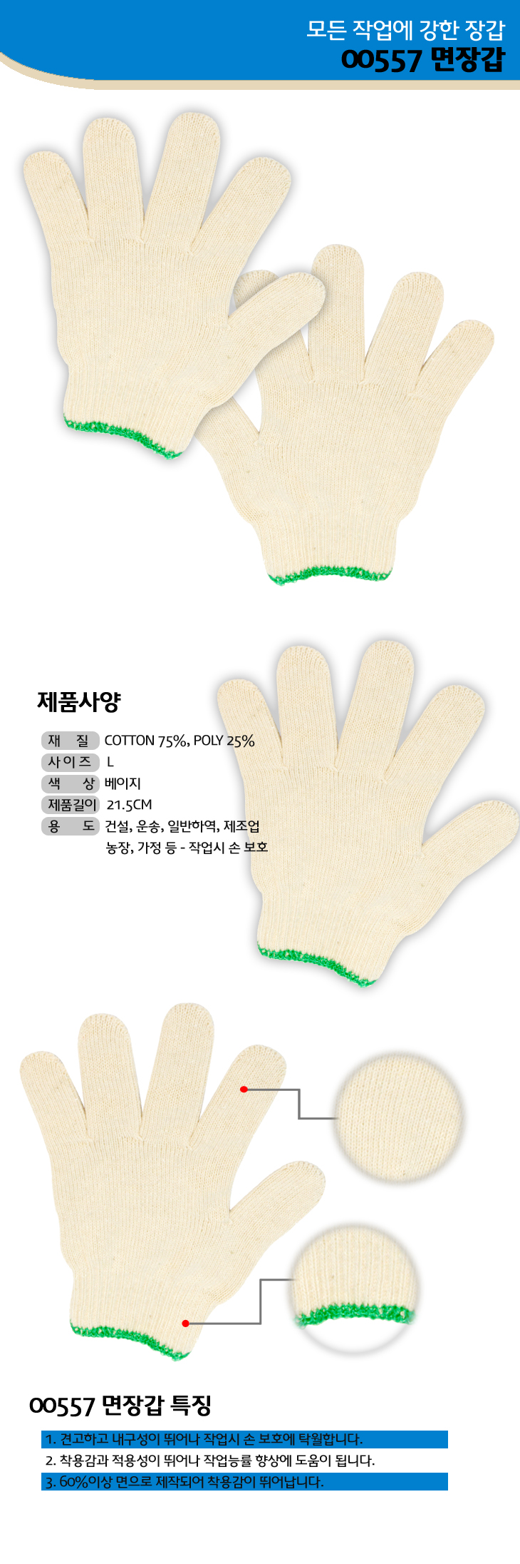 -견고하고 내구성이 뛰어나 작업시 손 보호에 탁월하다. -착용감과 적용성이 뛰어나 작업능률 향상에 도움이 됩니다. -60%이상 면으로 제작되어 착용감이 뛰어나다. |