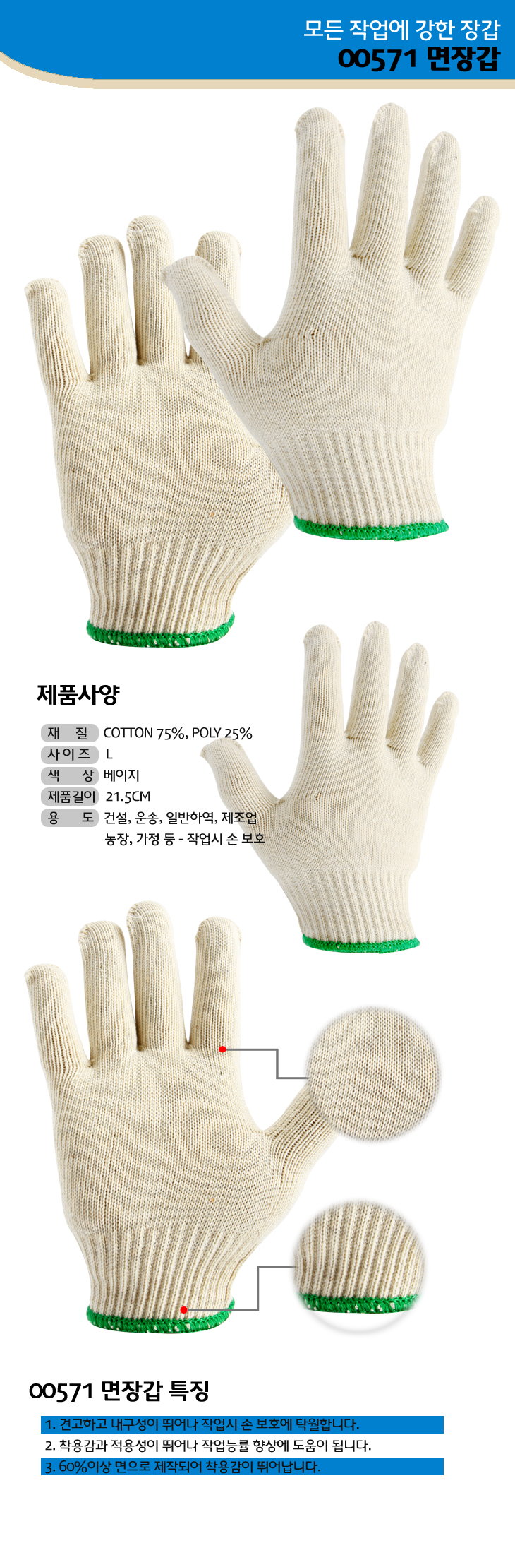 -견고하고 내구성이 뛰어나 작업시 손 보호에 탁월하다. -착용감과 적용성이 뛰어나 작업능률 향상에 도움이 됩니다. -60%이상 면으로 제작되어 착용감이 뛰어나다.