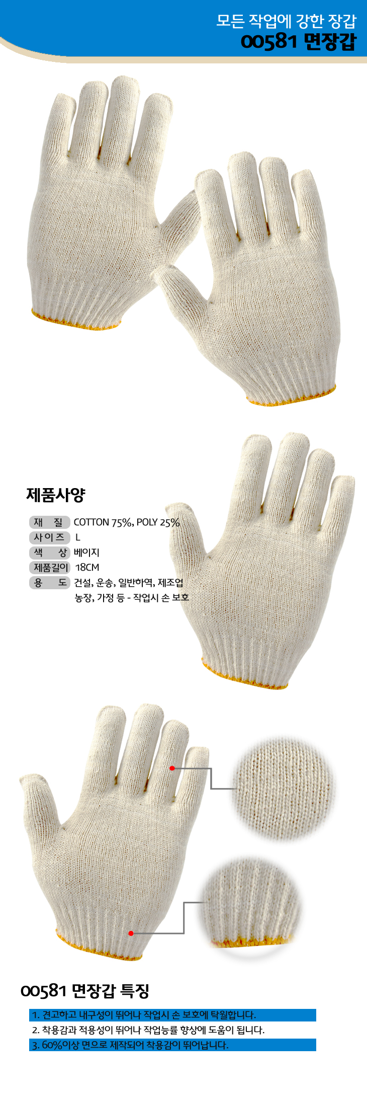 -견고하고 내구성이 뛰어나 작업시 손 보호에 탁월하다. -착용감과 적용성이 뛰어나 작업능률 향상에 도움이 됩니다. -60%이상 면으로 제작되어 착용감이 뛰어나다. |