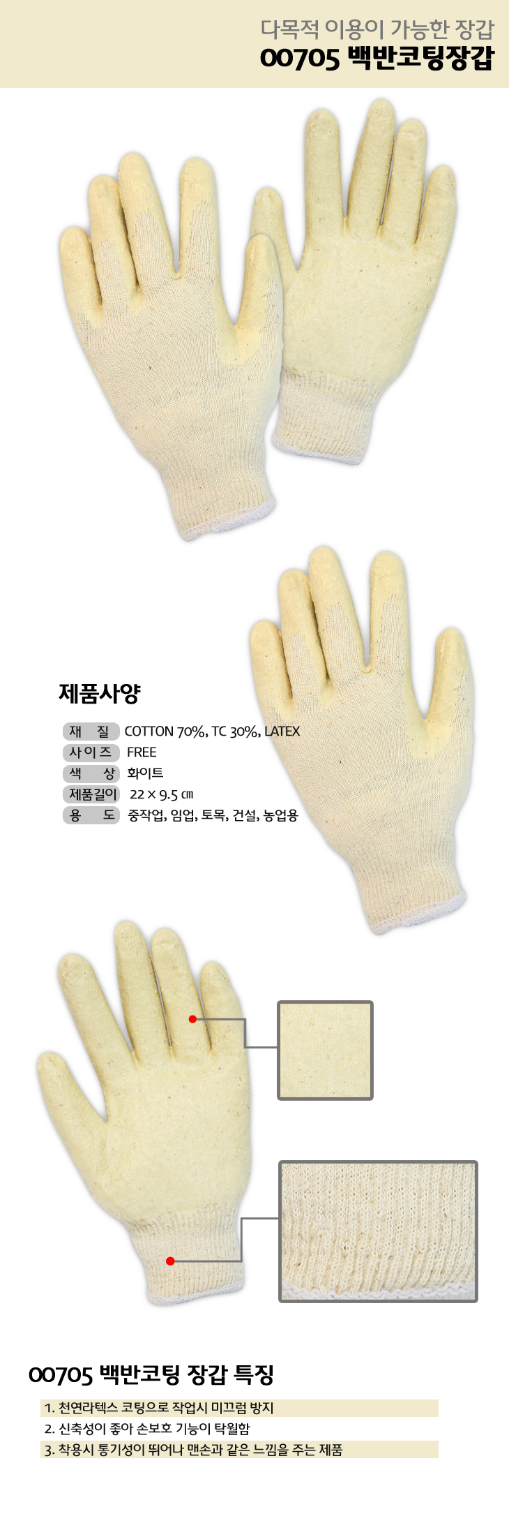-천연라텍스 코팅으로 작업시 미끄럼방지 -신축성이 좋아 손보호 기능이 탁월함 -착용시 통기성이 뛰어나 맨손과 같은 느낌을 주는 제품