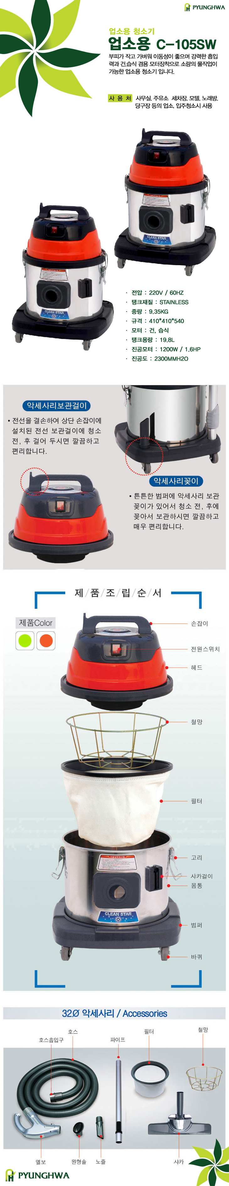 부피가 작고 가벼워 이동성이 좋으며 강력한 흡입력과 건,습식 겸용 모터장착으로 소량의 물작업이 가능한 업소용 청소기 입니다.