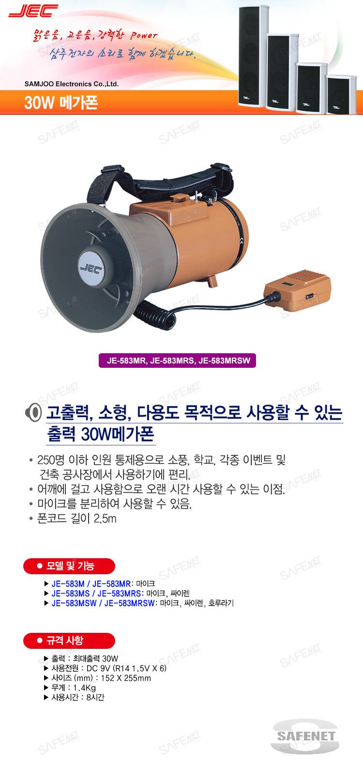 하울링이 아주 적은 메가폰 JE-583MR / JE-583MRSW - 출력 : 최대출력 30W