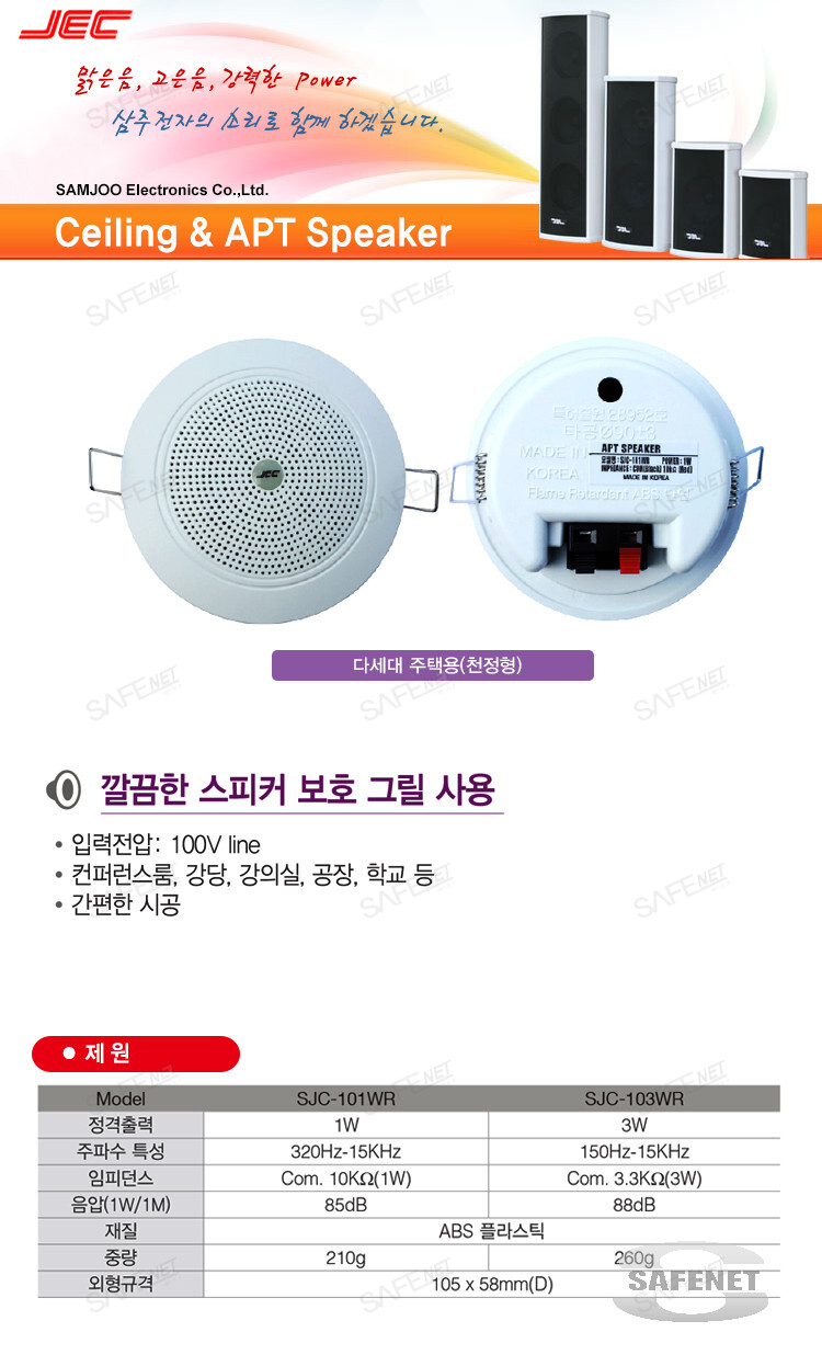 외관이 미백색의 심플한 디자인으로 설계되어 실내 어느공간이든 잘 어울리는 제품입니다. 3" 스피커를 사용 하였으며 음질이 맑고 선명하게 재생합니다. 천정및 벽면에 사용시 약 87 - 90Φ 로 타공하여 사용합니다.