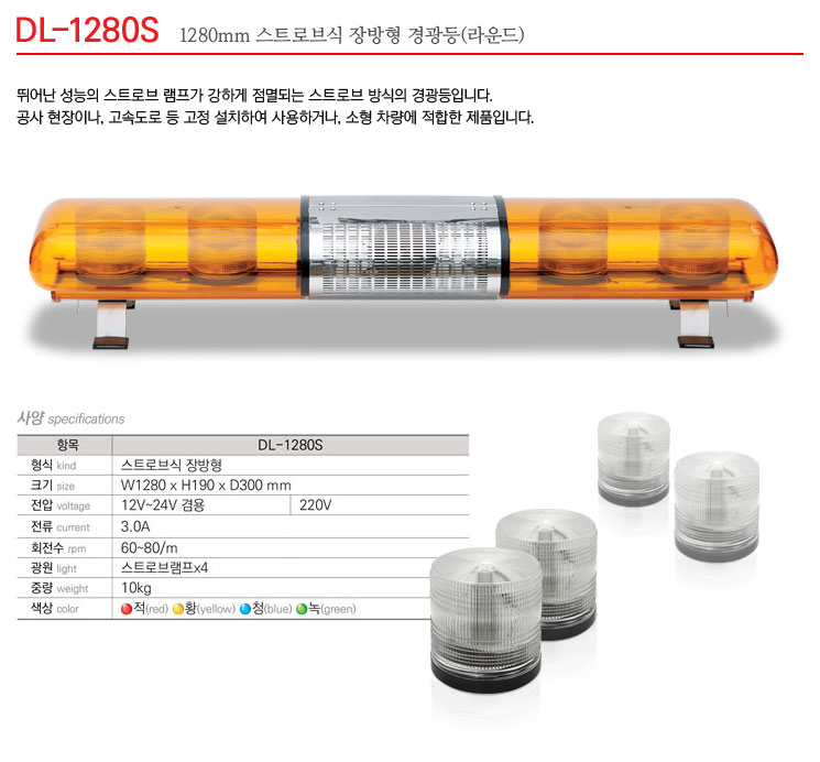 뛰어난 성능의 스트로브 램프가 강하게 점멸되는 스트로브 방식의 경광등입니다.