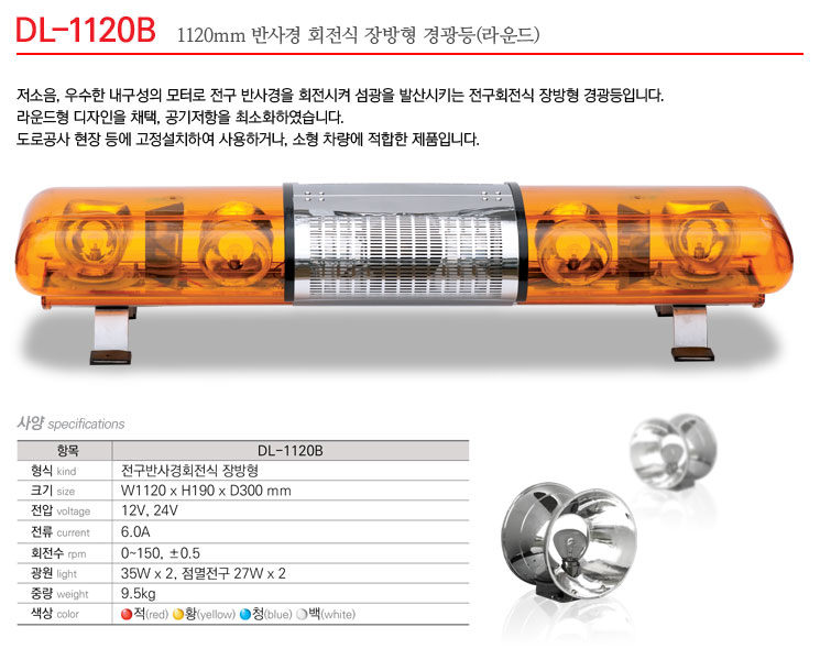 저소음, 우수한 내구성의 모터로 전구 반사경을 회전시켜 섬광을 발산시키는 전구회전식 장방형 경광등입니다.