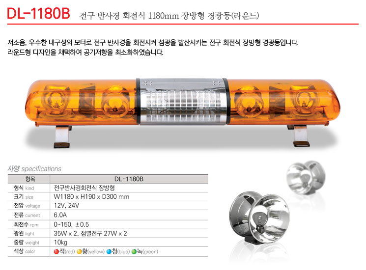 저소음, 우수한 내구성의 모터로 전구 반사경을 회전시켜 섬광을 발산시키는 전구회전식 장방형 경광등입니다.