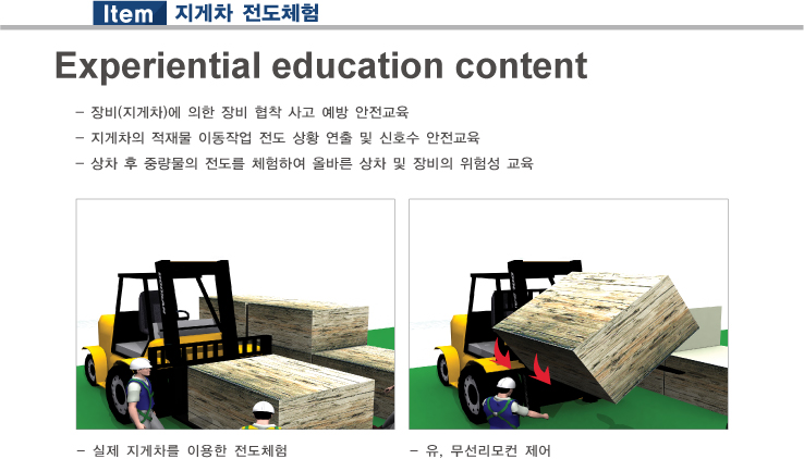 - 상차 후 중량물의 전도를 체험하여 올바른 상차 및 장비의 위험성 교육