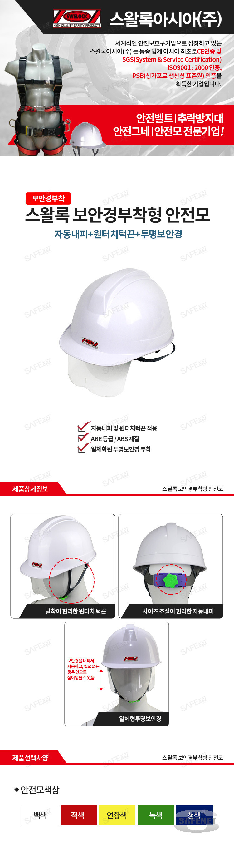 규격 안전모(ABS재질) / 보안경(PC재질) / ABE등급 / 자동내피 / 원터치턱끈 / 색상-선택가능