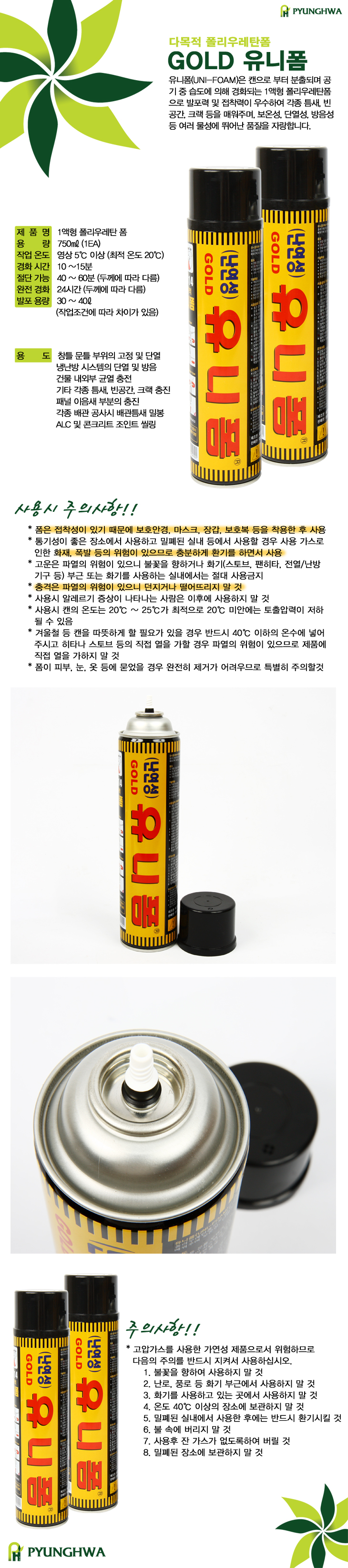 유니폼은 캔으로 부터 분출되며 공기중 습도에 의해 경화되는 1액형 폴리우레탄폼으로 발포력 및 접착력이 우수하여ㅕ 각종 틈새, 빈공간, 크랙 등을 매워주며 보온성, 단열성, 방음성 등 여러 물성에 뛰어난 품질을 자랑합니다.