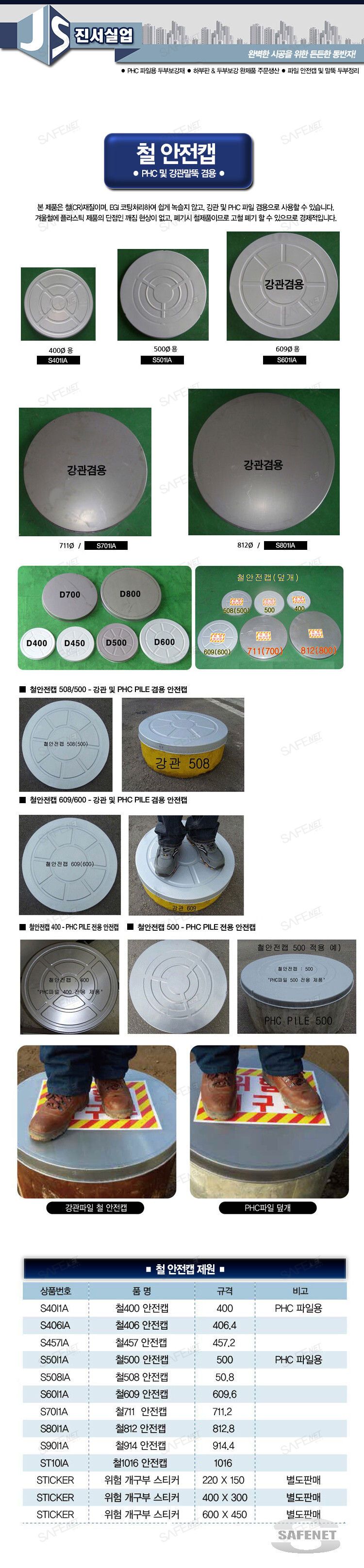 진서실업의 철안전캡은 철(CR) 재질이며, EGI 코팅처리하여 쉽게 녹슬지 않고, 강관 및 PHC 파일 겸용으로 사용할 수 있습니다.