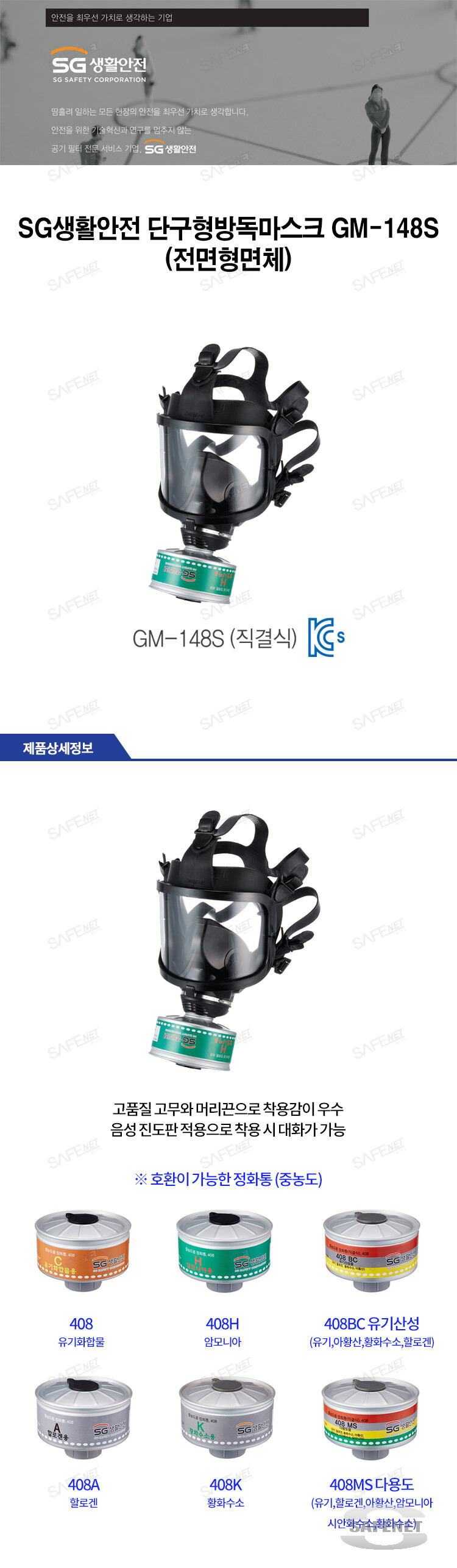 규격 SG생활안전 방독면체 / 직결식 / 전면형 / 중농도타입 / 408시리즈 정화통 사용