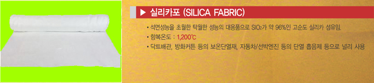 - 석면성능을 초월한 탁월한 성능의 대용품으로 SIO2가 약 96%인 고순도 실리카 섬유임.