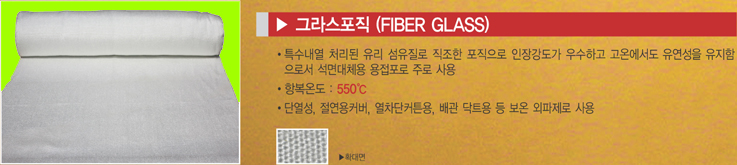 - 특수내열 처리된 유리 섬유질로 직조한 포직으로 인장강도가 우수하고 고온에서도 유연성을 유지함으로서 석면대체용 용접포로 주로 사용