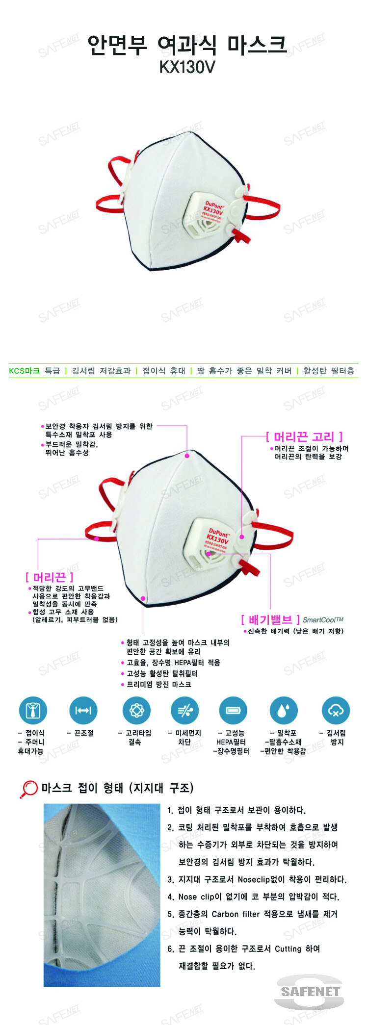 규격 배기밸브 / 활성탄필터층 / 다층 구조의 초정전 필터 / 접이식으로 휴대 및 보관이 편리
