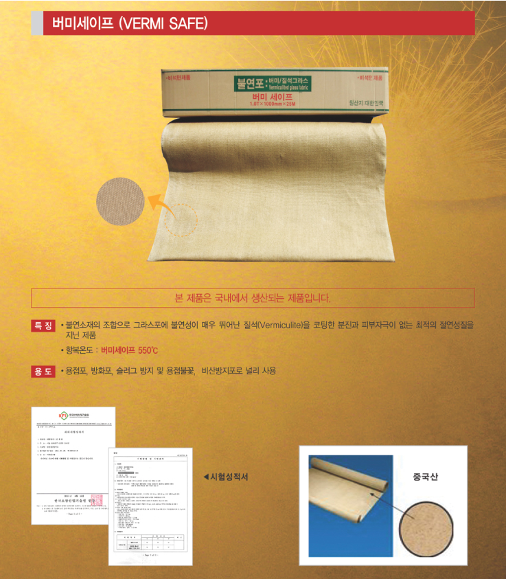 - 용접포, 방화포, 슬러그 방지 및 용접불꽃, 비산방지포로 널리 사용