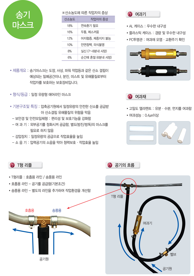 일반형 송기마스크는 소음기, 후드, 밸브, 여과기, 감압장치