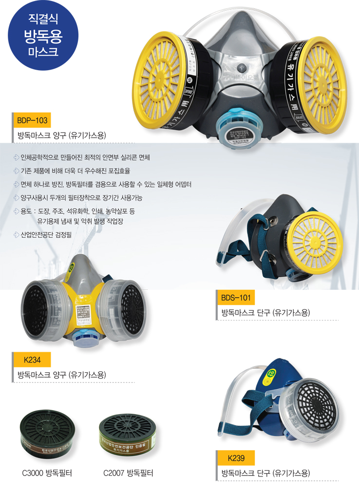 - 인체공학적으로 만들어진 최적의 안면부 실리콘 면체 - 기존 제품에 비해 더욱 더 우수해진 포집효율 - 면체 하나로 방진, 방독필터를 겸용으로 사용할 수 있는 일체형 어뎁터 - 양구사용시 두개의 필터장착으로 장기간 사용가능 - 용도 : 도장, 주조, 석유화학, 인쇄, 농약살포 등 유기용제 냄새 및 악취 발생 작업장 - 산업안전공단 검정필