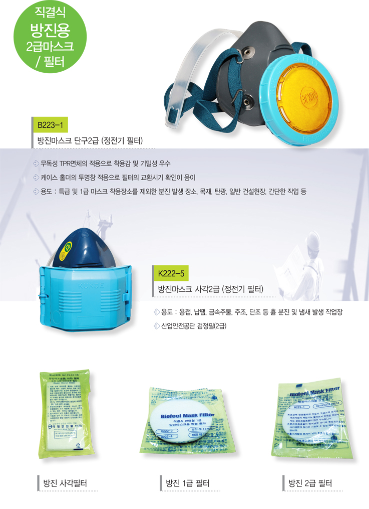 - 용도 : 특급 및 1급 마스크 착용장소를 제외한 분진 발생 장소, 목재, 탄광, 일반 건설현장, 간단한 작업 등