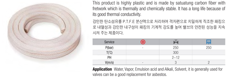 강인한 탄소섬유를 P.T.F.E 분산액으로 처리하여 격자편으로 치밀하게 직조한 패킹으 로 내열성과 강인한 내구성이 패킹의 기계적 강도를 높여 밸브의 안전된 성능을 지속 시켜 주는 제품이다.