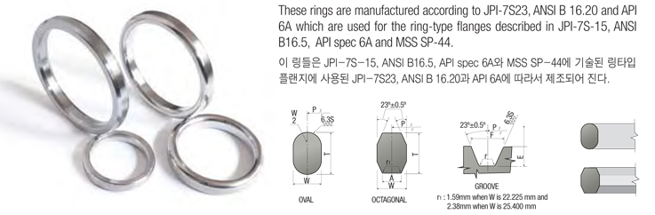 이 링들은 JPI-7S-15, ANSI B16.5, API spec 6A와 MSS SP-44에 기술된 링타입 플랜지에 사용된 JPI-7S23, ANSI B 16.20과 API 6A에 따라서 제조되어 진다.