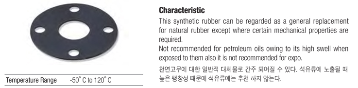 천연고무에 대한 일반적 대체물로 간주 되어질 수 있다. 석유류에 노출될 때 높은 팽창성 때문에 석유류에는 추천 하지 않는다.