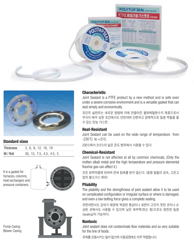 죠인트실란트는 새로운 방법에 의해 만들어진 불화에틸렌수지 제품으로서 부식이 매우 심한 조건에서도 안전하며 간편하고 경제적으로 밀봉 역할을 할수 있는 만능 가스켓입니다.