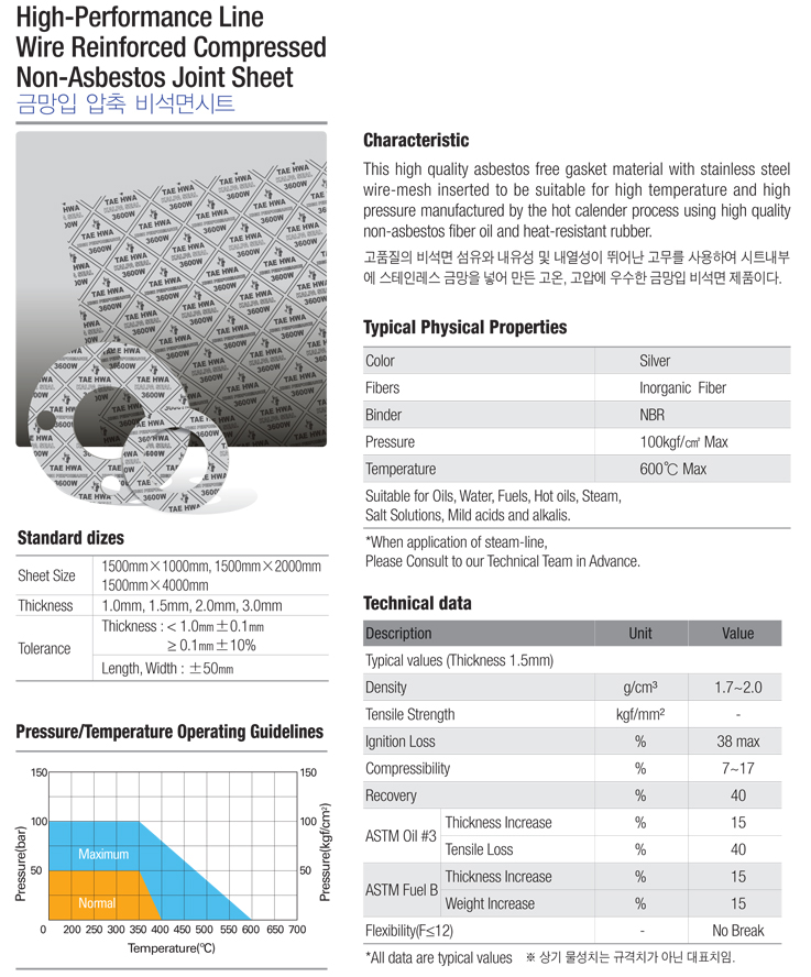 고품질의 비석면 섬유와 내유성 및 내열성이 뛰어난 고무를 사용하여 시트내부에 스테인레스 금망을 넣어 만든 고온, 고압에 우수한 금망입 비석면 제품이다.