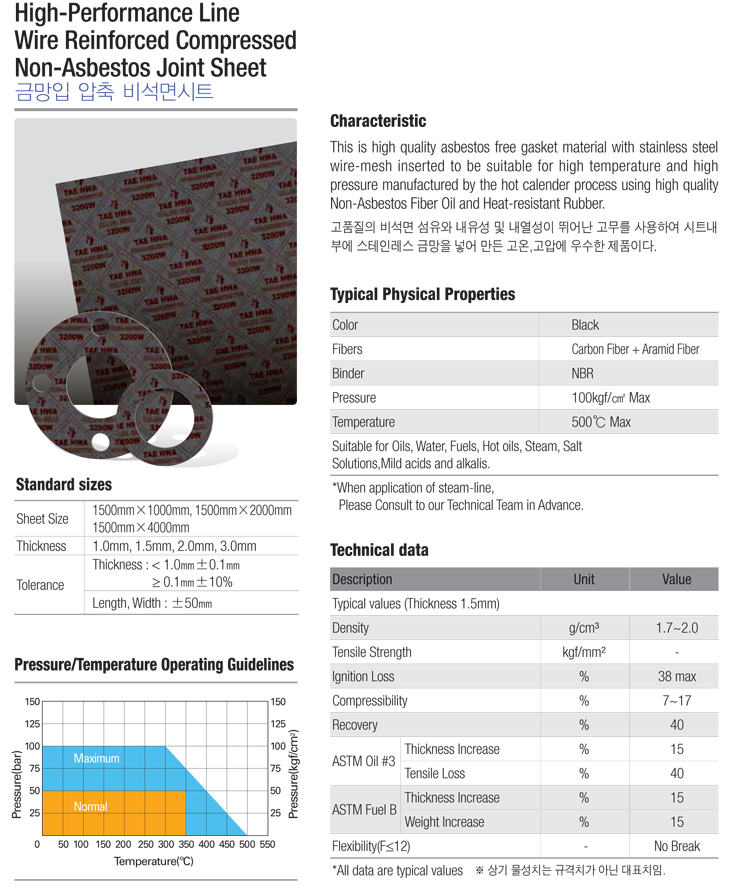 고품질의 비석면 섬유와 내유성 및 내열성이 뛰어난 고무를 사용하여 시트내부에 스테인레스 금망을 넣어 만든 고온,고압에 우수한 제품이다.