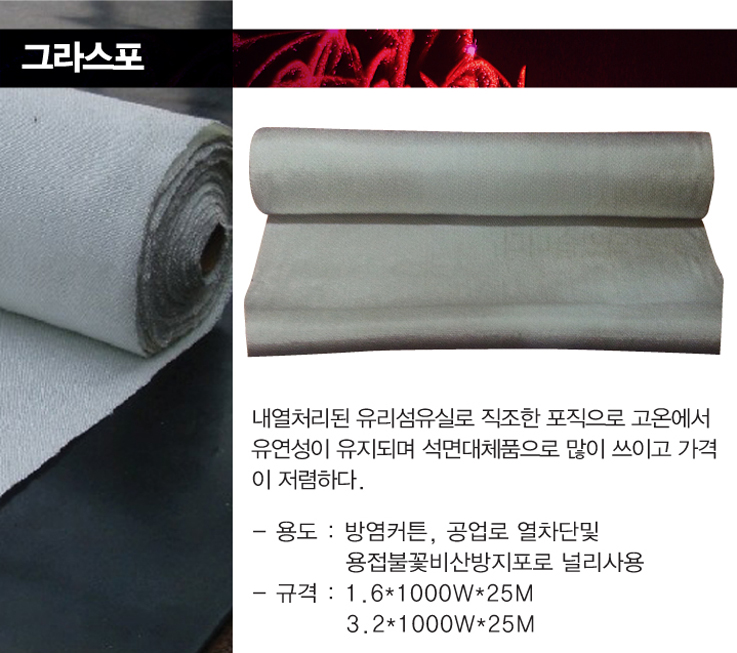 - 용도 : 방염커튼, 공업로 열차단및 용접불꽃비산방지포로 널리사용